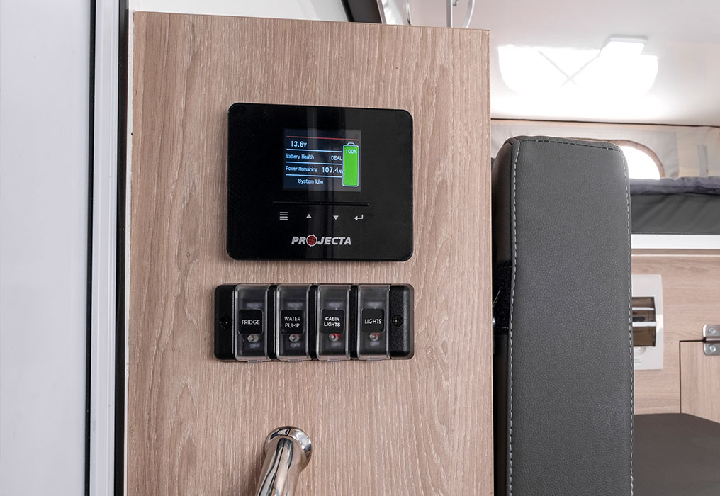Fresh water storage and an onboard battery system support independent touring. These systems enable practical off-grid functionality for remote stays.